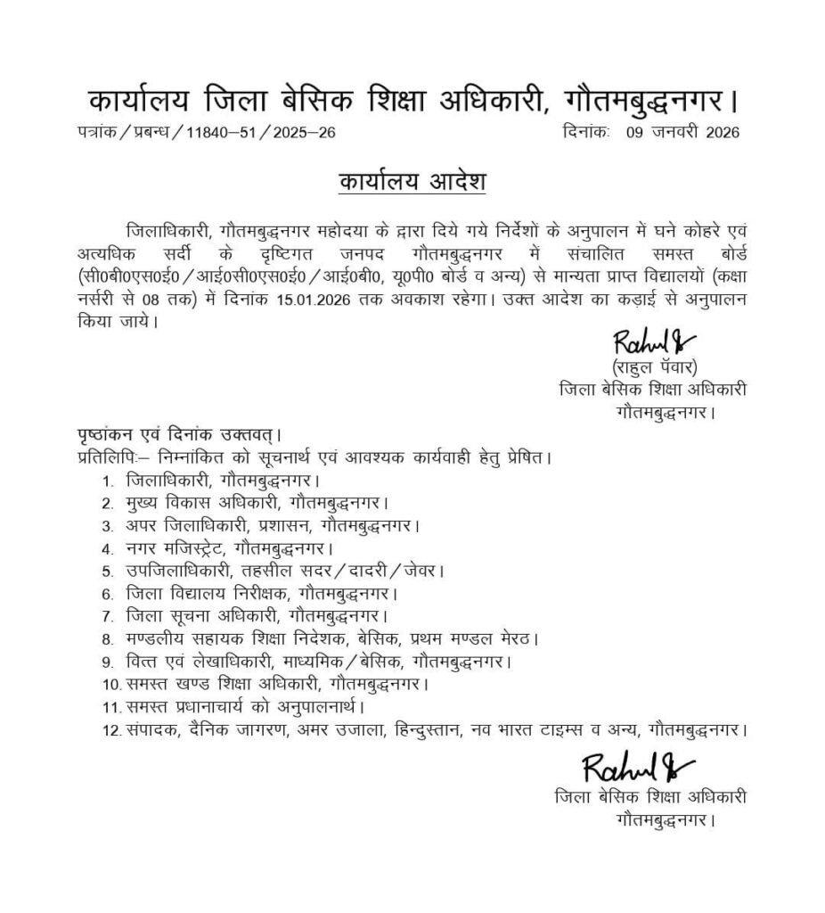 Panchayat 24 (ग्रेटर नोएडा) : सर्दी एवं घने कोहरे के चलते गौतम बुद्ध नगर के सभी विद्यालयों को लेकर जिलाधिकारी द्वारा नया आदेश दिया गया है। आदेश के अनुसार कक्षा नर्सरी से लेकर आठवीं तक के सभी विद्यालय सभी विद्यालयों में आगमित 15 जनवरी तक अवकाश रहेगा। आदेश की अभिलाषा करने वाले क्या संसाधन को एवं प्रबंध को के खिलाफ कड़ी कार्रवाई के भी निर्देश दिए गए हैं।
