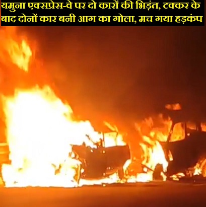यमुना एक्सप्रेसवे पर दो वाहनों की टक्कर, आग लगने से कार बनी आग का गोला, मचा हड़कंप